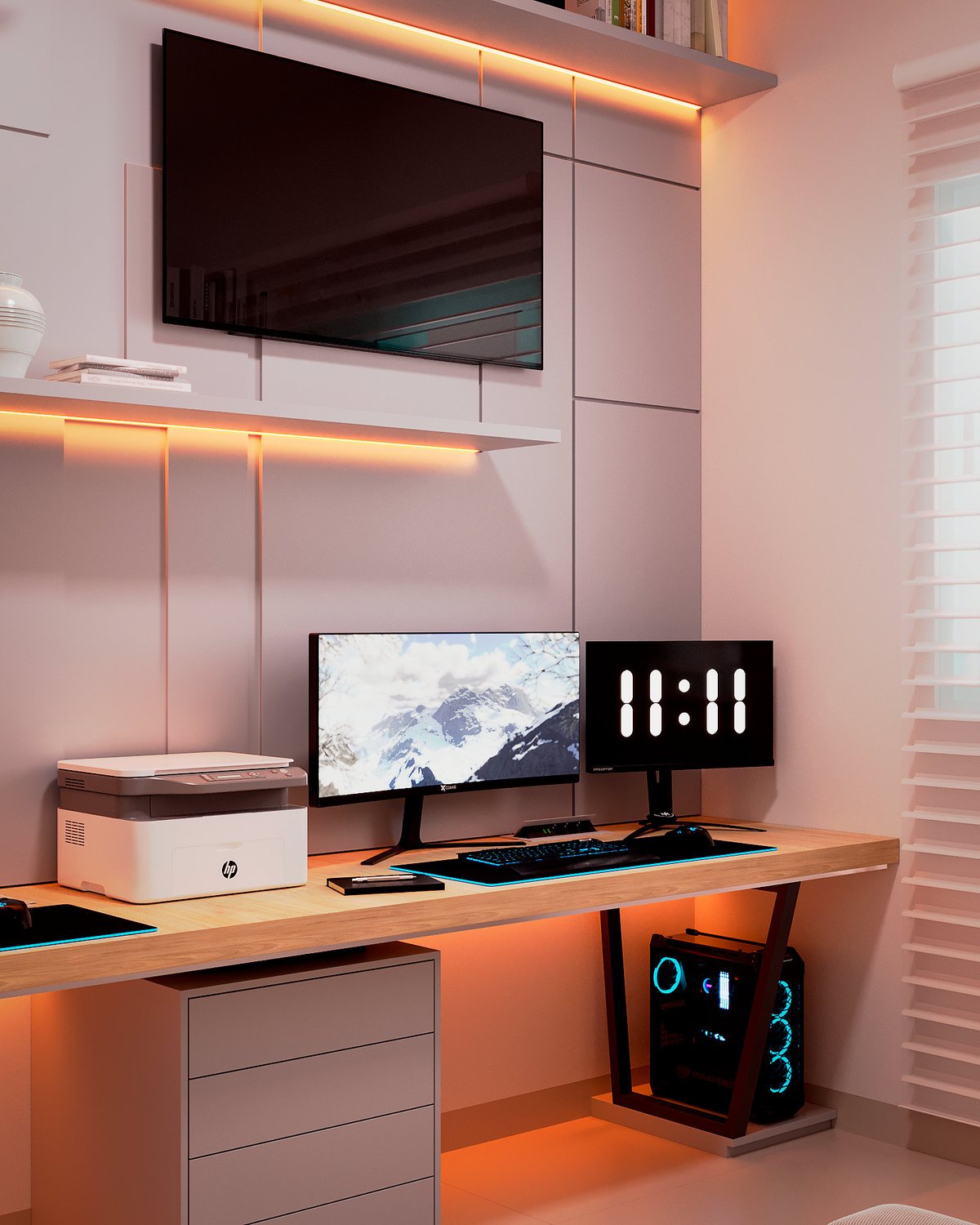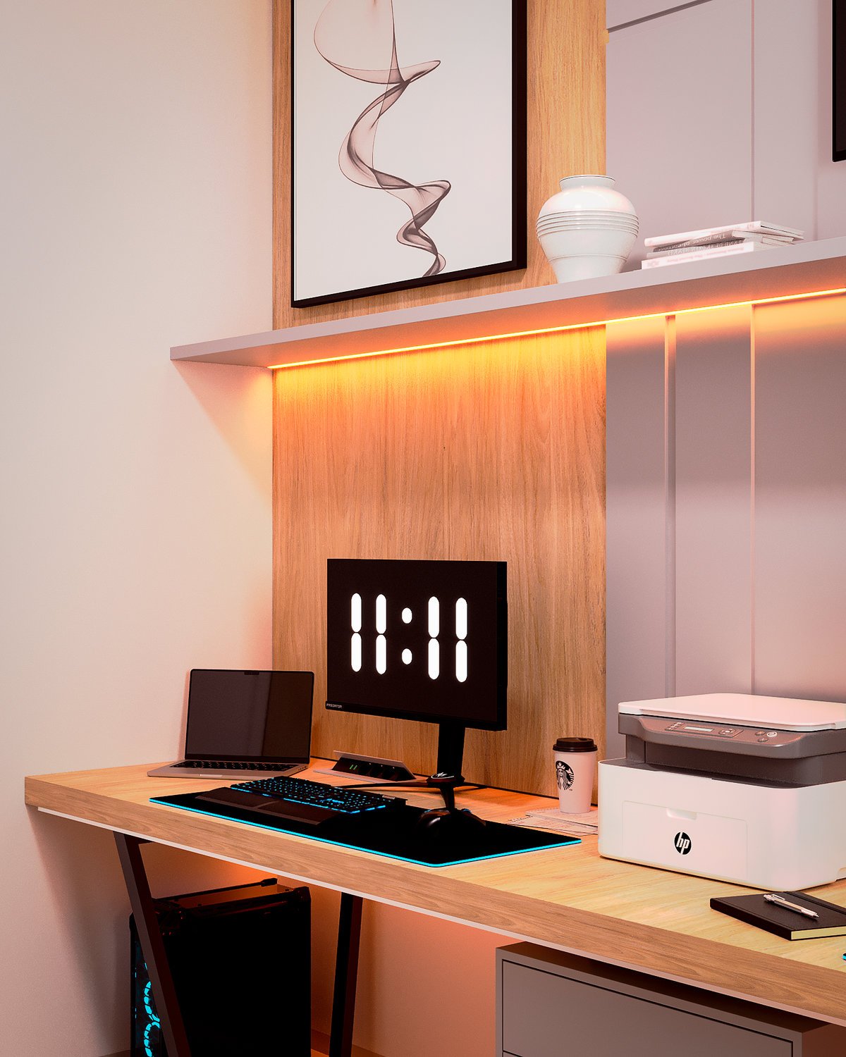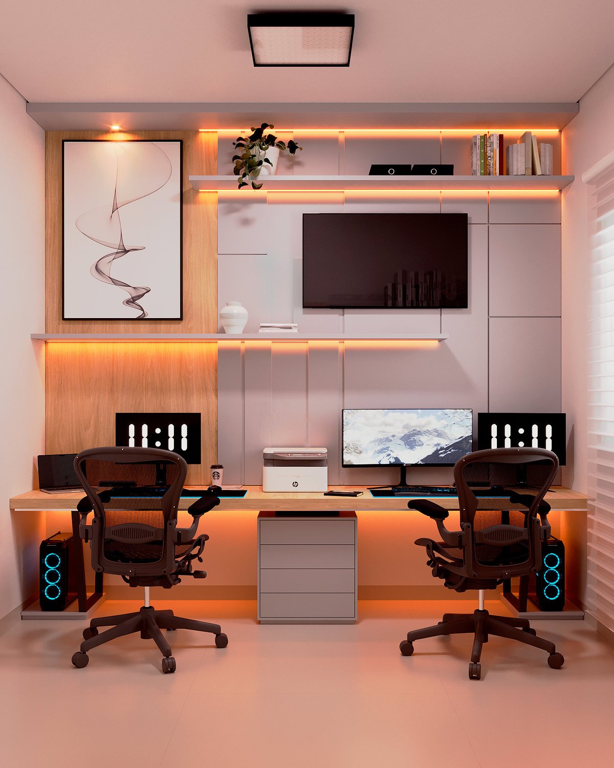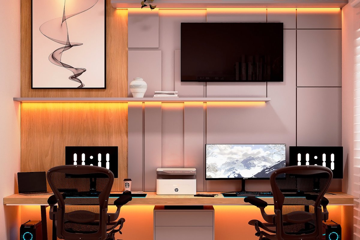 Este projeto redefine o conceito de “work from home”, unindo o máximo desempenho tecnológico a um design de interiores acolhedor e organizado. É o espaço ideal para casais de profissionais ou entusiastas de tecnologia que não abrem mão do estilo.