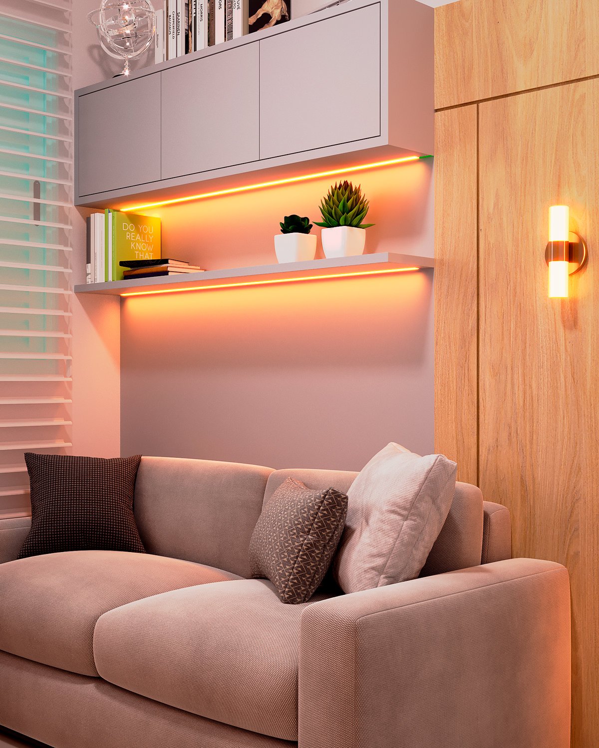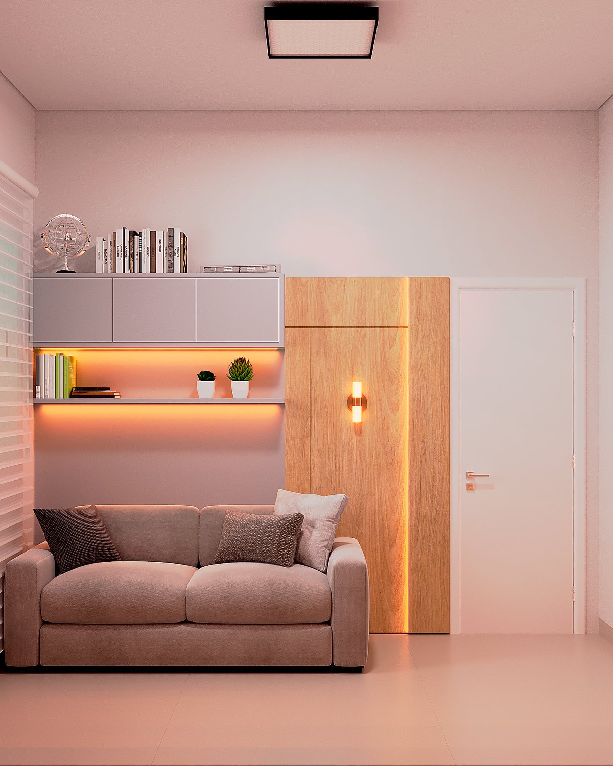 – Iluminação Cênica e Funcional: O uso estratégico de fitas de LED embutidas com temperatura de cor quente cria um efeito de luz indireta que reduz a fadiga ocular e destaca a volumetria da marcenaria.